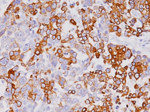 Cytokeratin 7 is an intermediate filament protein (IFP) of 54 kDa that recognizes the simple epithelium found in most glandular and transitional epithelia; but not that which is found in the stratified squamous epithelia. This rabbit monoclonal antibody [clone BC1] is highly specific to cytokeratin 7 and shows no cross-reaction with other IFP’s. Cytokeratin 7 is expressed in epithelial cells of ovary, lung and breast. It is often used in conjunction with cytokeratin 20 and CDX-2 in distinguishing pulmonary, ovarian and breast carcinomas (CK7+) from most colon carcinomas (CK7-).