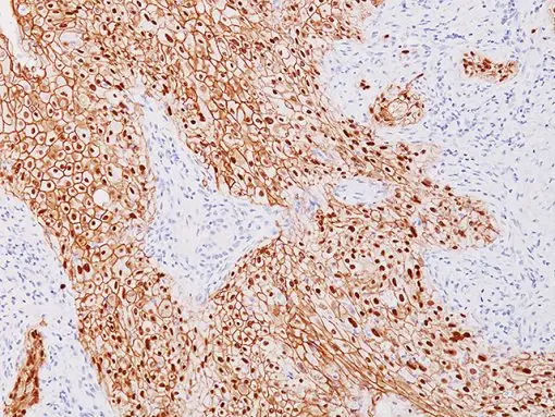 The mouse monoclonal antibody p40 [BC28] recognizes an epitope unique to the p40 protein and may have applications in cases where p63 has traditionally been used. To date, p63 [4A4] has been a frequently used marker for lung SqCC, as well as for bladder,and p40 proteins (7). As a result, p63 [4A4] has proven to be a sensitive marker for lung SqCC; however, it suffers from specificity limitations due to reactivity in a subset of lung adenocarcinomas (ADC). In contrast, p40 is selectively expressed in lung SqCC, offering an opportunity for improved specificity (5,7,8). p40 (M) [BC28] recognizes an epitope unique to p40, which may result in diminished reactivity in lung ADC and increased specificity.