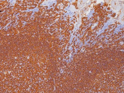 The PD7/26/16 and 2B11 antibody clones have been designated as CD45. CD45 belongs to a leukocyte common antigen (LCA antibody) family of glycoproteins with molecular weights of 180, 190, 205 and 220 kDa. CD45 recognizes an antigen found on lymphoid cells. Studies have shown that most neoplastic B-cells and T-cells stain positively with CD45 in leukemia and in non-Hodgkin’s lymphomas; whereas most neoplastic myeloid and erythroid cells are negative. CD45 has also been observed to be unreactive with epithelium and connective tissues in published studies.