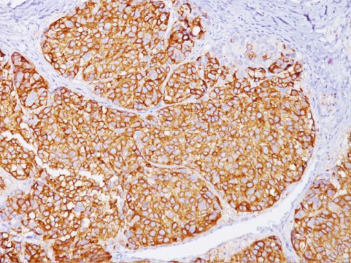 The HMB45 clone reacts with a neuraminidase-sensitive oligosaccharide side chain of a glycoconjugate present in immature melanosomes. The HMB45-reactive antigen is present in cutaneous melanocytes, prenatal and infantile retinal pigment epithelium and melanoma cells. It is also thought to be oncofetal in nature. This antibody has been shown to label the majority of melanomas. The MART-1/Melan A recognizes a protein of 18kDa, identified at MART-1 (Melanoma Antigen Recognized by T cells 1) or Melan-A. The MART-1 recognizes a subcellular fraction found in melanosomes. The antibody labels melanomas and tumors showing melanocytic differentiation (1,2). It does not mark neoplasms of epithelial origin, lymphomas or mesenchymal tumors. Melan-A is a useful addition to melanoma panels which are specific to melanocytic lesions. Studies have also shown that MART-1 is more sensitive than HMB45 when labeling metastatic melanomas. HMB45 and MART-1 are coexpressed in the majority of melanomas, as well as solely expressed in certain cases. Thus, the HMB45 and MART-1 cocktail is potentially more sensitive than HMB45 and MART-1 alone. The MART-1 is a cocktail of clones M2-7C10 + M2- 9E3. The combination of HMB45 and the MART-1 cocktail make this triple antibody cocktail a first-order pan melanoma screener (3).