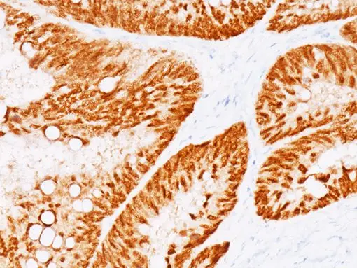 CDX2 is a homeobox gene that encodes an intestine-specific transcription factor and is expressed in the nuclei of epithelial cells of the intestine, from duodenum to rectum. The CDX2 protein is expressed in primary and metastatic colorectal carcinomas (1,2). It has also been identified in primary ovarian mucinous tumors and metastatic mucinous carcinomas involving the ovary (3). Studies have shown that the CDX2 marker is a more specific and sensitive marker when compared to CK20 (4). According to in-house studies, CDX2 [BC39] showed equal or superior sensitivity to clone CDX2-88, with virtually identical specificity.