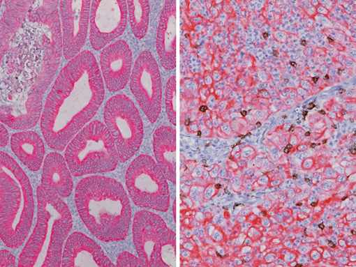 Clones EP17 and EP30 recognize cytokeratins (CK) 8 and 18, both of which are low molecular weight intermediate filament proteins (52.5 kDa and 45 kDa respectively). In normal tissues, CK8/18 recognizes all simple and glandular epithelium (1). In neoplastic tissues, CK8/18 may prove useful for the identification of most adenocarcinomas and some squamous cell carcinomas. CK8/18 expression patterns may also aid in the classification of tumors of unknown origin and poorly differentiated carcinomas (1-3). CK8/18 rabbit monoclonal may be useful as a staining mask in a multiplex stain with mouse monoclonal antibodies such as Ki-67, PD-1 or CD8. As CK8/18 does not stain stromal components or tumor infiltrating lymphocytes in various carcinomas such as breast or colon cancers, a CK8/18 staining mask may be helpful with these applications.