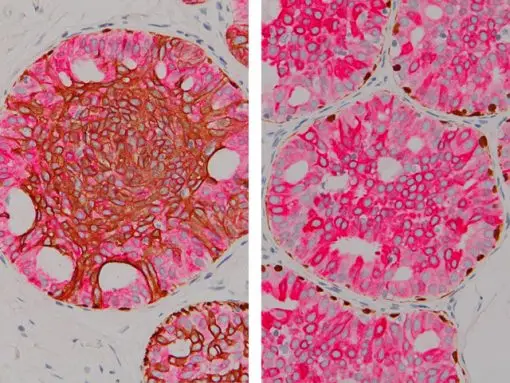 IHC markers CK5, CK14, p63, CK7 and CK18 complement morphological evaluation of breast lesions, due to the differential expression of the luminal (CK7/18) vs. basal and myoepithelial markers (CK5/14, p63). Usual ductal hyperplasia is associated with positive basal cells markers, intermixed with positive luminal cells. Most atypical ductal hyperplasia and low grade ductal carcinoma in situ cases are basal marker negative and luminal marker positive. These antibodies, in combination with hematoxylin and eosin (H&E), have been shown to significantly increase diagnostic inter-observer agreement among pathologists.