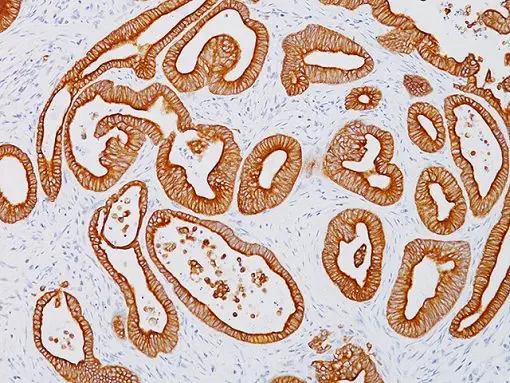 Cytokeratin 18 antibody (CK18) [DC10] is a 45 kDa acidic intermediate filament protein. It is normally co-expressed with Cytokeratin 8 and is found in most simple ductal and glandular epithelia. Studies have shown that this antibody reacts with a wide variety of simple epithelia such as gastrointestinal tract, lung, breast, pancreas, ovary and thyroid tumors, whereas tumor cells of non-epithelial origin such as glioma, melanoma and osteosarcoma are not reactive. It also does not react with stratified squamous epithelium on most squamous cell carcinoma.